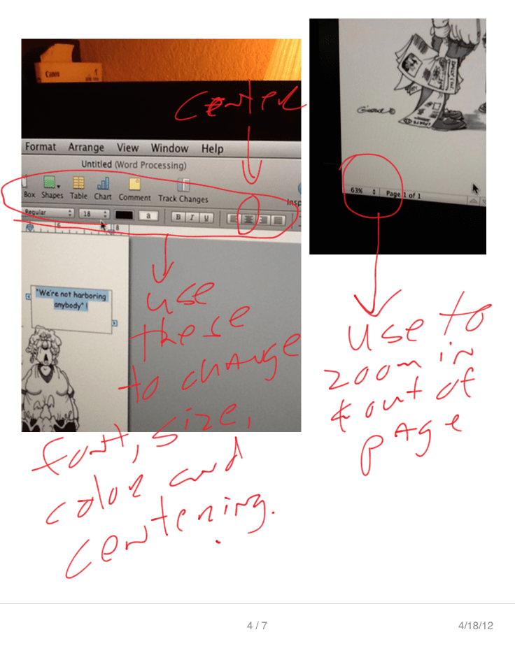 Today’s notes were created for a cartoonist who has a Mac and has already learned how to scan in his cartoons (via my tutelage months ago), but now he wanted to learn how to add his captions using the computer. The goal was to get it done with as few steps as possible and with his existing software. We used Apple Pages and Preview to get the job done.